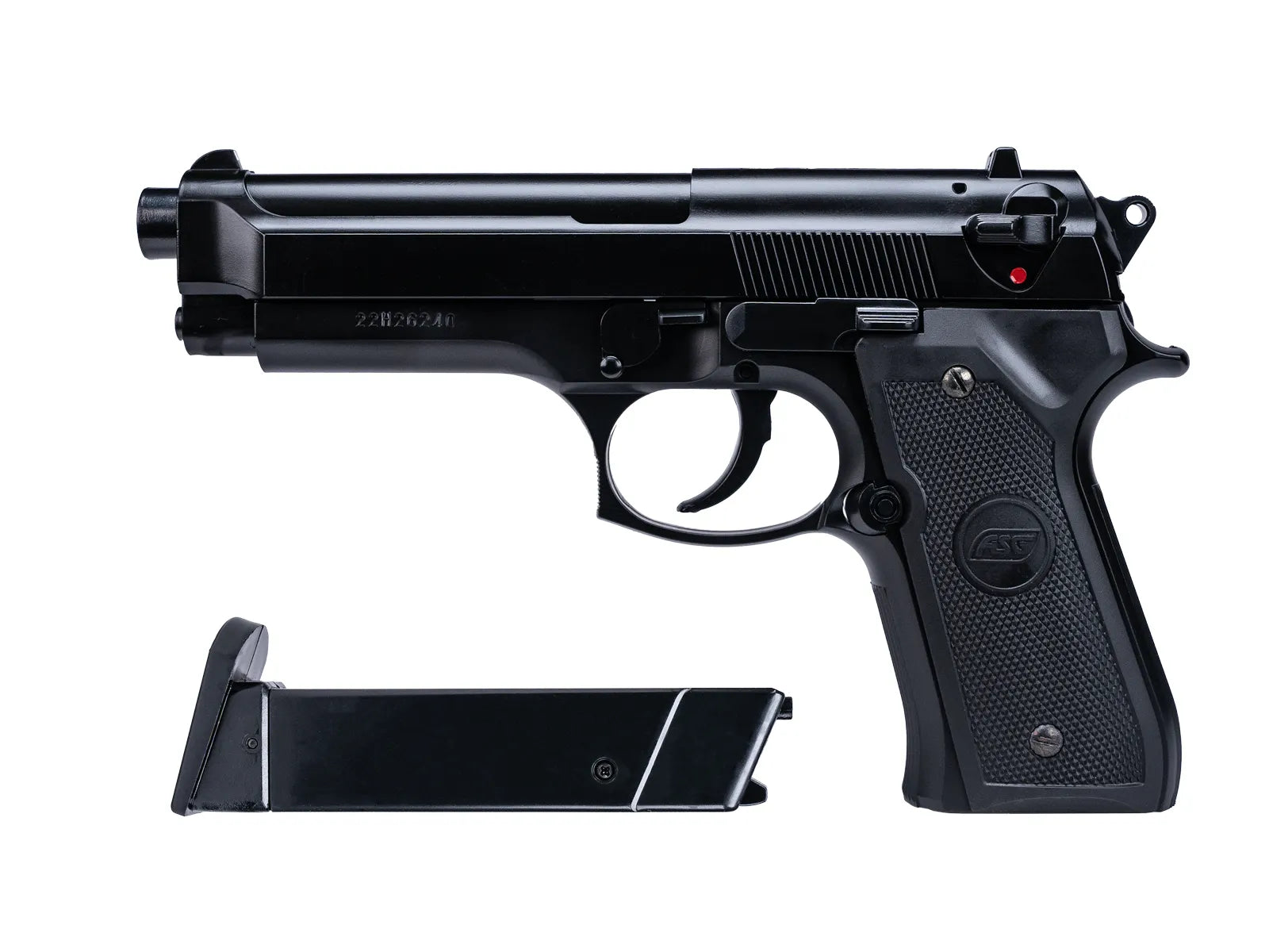 The spring operated high performance version of the classic M92FS. The high power spring and fixed Hop-up makes the model very accurate while being simple and reliable. This model is supplied with a magazine able to contain 12 BB’s.