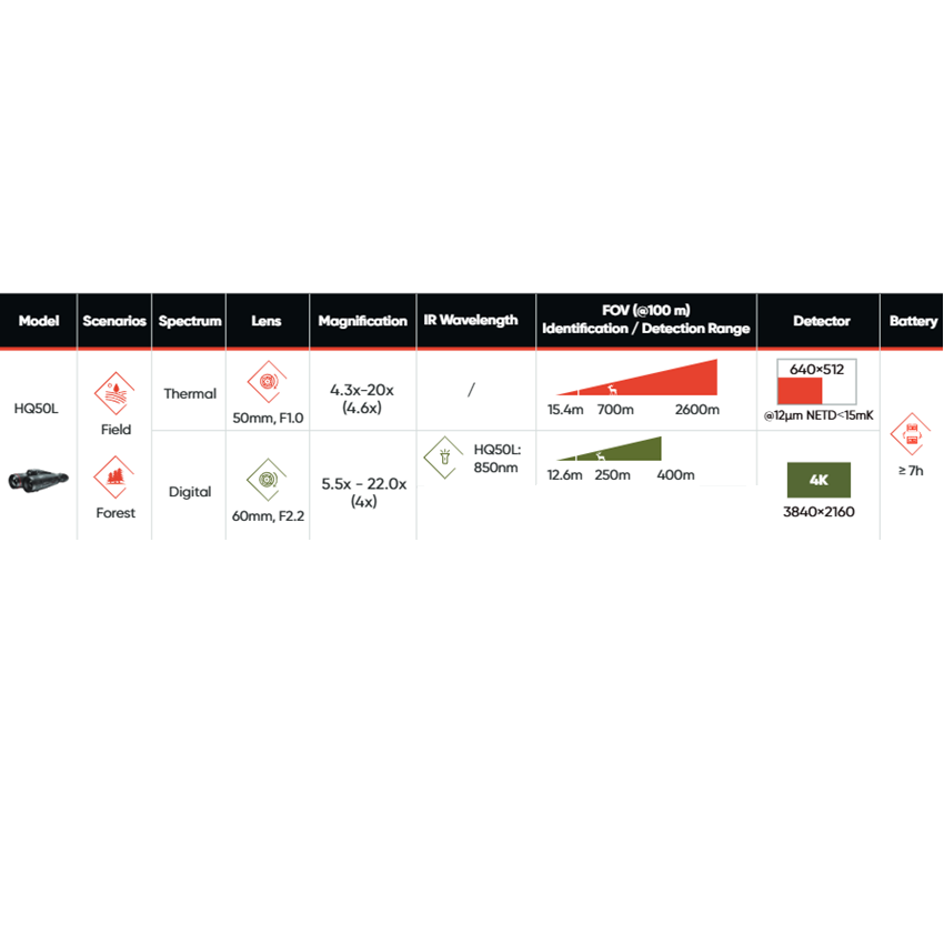 HIKMICRO HABROK Pro HQ50L multi-spectrum binocular is equipped with an 15 mK NETD, 640 × 512 thermal detector @50 mm thermal lens and an advanced 4K digital detector with 60mm lens, ensuring perfect image quality and detail recognition in various weather and light conditions. Combined with a 1000 m Laser rangefinder and replaceable IR emitter @850 nm wavelength, this all-in-one binocular can be applied mainly in forest & field hunting, birding, animal searching, rescuing and marine scenario.